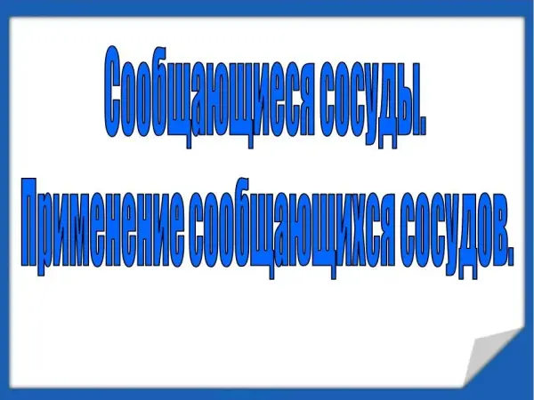 Цели урока: организовать деятельность учащихся по восприятию, осмыслению и первичному закреплению представления о сообщающихся сосудах, продолжить формирование понятия давления жидкости на дно сосуда и изучение закона Паскаля на примере однородных и разнородных жидкостей в сообщающихся сосудах, о роли сообщающихся сосудов в быту и технике.