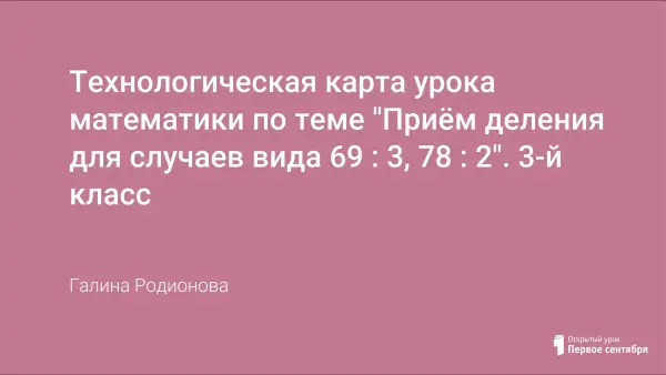 Цели урока: познакомить с приёмами деления для случаев вида 69 : 3, 78 : 2; сравнить разные способы вычислений, выбирать наиболее удобный, совершенствовать навыки устного счета.