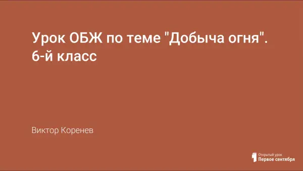 Цель урока: познакомить детей с правилами выбора места для разведения костра, способами добывания и сохранения огня. В ходе урока учащиеся знакомятся с несколькими способами добычи огня с помощью подручных средств, с типами различных костров, выполняют практическую работу по добыче огня.