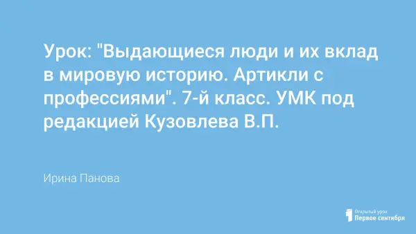 Учащиеся закрепляют новую лексику и навык использования артикля с профессиями; знакомятся с рядом выдающихся деятелей России. В ходе урока используется два приема рефлексии: по содержанию и деятельности, в трех формах: «Мозговой штурм» + кластер; таблицы «Соотнеси»/ «Отметь»; «ПМИ – плюс, минус, интересно».