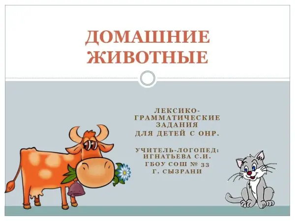 Презентация «Домашние животные» предназначена для индивидуальных и фронтальных занятий по развитию лексико-грамматических категорий у детей с общим недоразвитием речи II и III уровня. Дидактические игры и упражнения созданы в программе PowerPoint. Презентация может быть использована логопедами, воспитателями коррекционных групп и родителями.