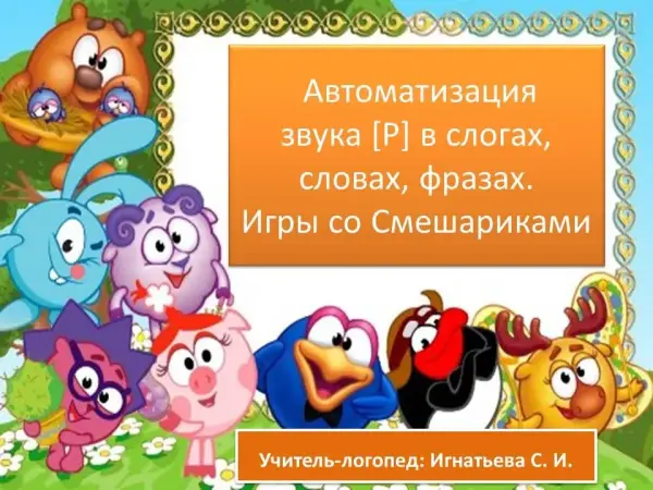 Презентация «Автоматизация [Р]. Игры со Смешариками» предназначена для индивидуальных и фронтальных занятий по формированию правильного звукопроизношения и развитию лексико-грамматических категорий у детей с общим недоразвитием речи III уровня. Игровые упражнения и задания созданы в программе PowerPoint. Презентация может быть использована логопедами, воспитателями коррекционных групп и родителями для автоматизации звука [Р] в слогах, словах, фразах.