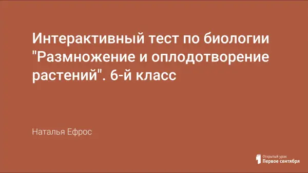 Интерактивный тест по биологии по теме «Размножение и оплодотворение у растений» (к учебнику Пономарева И.Н., Николаев И.В., Корнилова О.А.; М:Вентана-Граф, (АЛГОРИТМ УСПЕХА). Изд. 4-е,стереотип. ФГОС) проводится в целях осуществления мониторинга результатов освоения программы по биологии 6-го класса в соответствии с ФГОС и направлены на выявление уровня подготовки обучающихся по теме «Размножение и оплодотворение у растений».