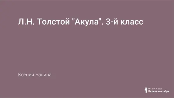 Цели урока: познакомить учащихся с произведениями Л.Н.Толстого “Акула, его сюжетом (формирование умений устанавливать последовательность событий в тексте); совершенствование навыка выразительного, осознанного чтения, пробуждение познавательной активности.