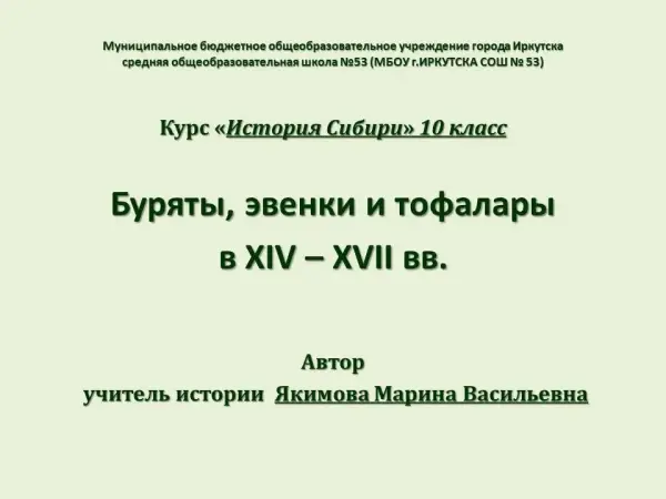 Цели урока: способствовать формированию представлений у учащихся об особенностях жизни коренных народов Восточной Сибири, их занятиях и быте; продолжить формирование у учащихся навыков работы с учебным пособием, иллюстрациями, картой; способствовать развитию логического мышления, устной речи; продолжить работу по формированию общеучебных интеллектуальных умений: наблюдения, слушания, чтения, анализа и обобщения;