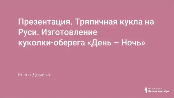 Цели занятия: формировать у детей интерес к традициям русского народа, его истории; показать значимость народной игрушки в воспитании детей на Руси; создать положительную эмоциональную среду общения; познакомить детей с приемами изготовления традиционной тряпичной куклы бесшовным способом; совершенствовать трудовые навыки (сворачивание, обматывание, завязывание), развитие мелкой моторики; вызвать интерес к совместной деятельности, чувство доброжелательного отношения; формировать у детей художественный вкус, развивать воображение; развивать диалогическую речь, обогащать словарный запас.