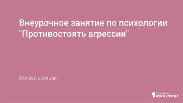 Данное занятие призвано помочь подросткам разобраться в проблеме агрессивного поведения, определить причины и последствия агрессии, оказать помощь в предупреждении и преодолении агрессивного, конфликтного поведения; сформировать чувство эмпатии, умение оценивать ситуацию и поведение окружающих; обучить "ненаправленным" способам преодоления собственных отрицательных эмоций, состояний и приемам регуляции психического равновесия.