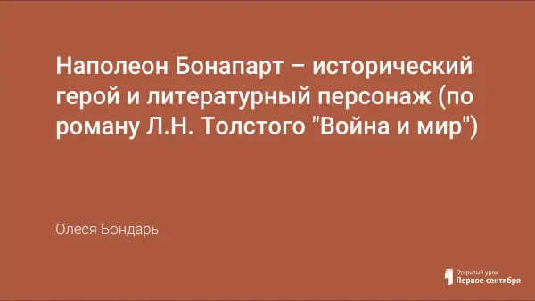 На уроке анализируются приемы создания образа Наполеона в романе Л.Н. Толстого "Война и мир", ведется работа над созданием зрительного образа эпохи. С этой целью в урок в качестве иллюстраций включены произведения русской и зарубежной живописи. В ходе урока учащиеся составляют таблицы, аргументируют ответ с помощью цитирования, анализируют текст романа и произведения живописи.