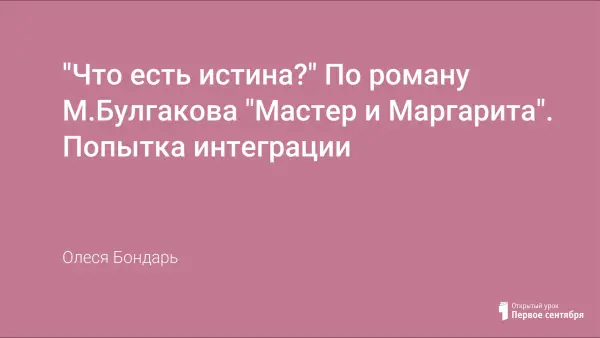 На уроке анализируются приемы создания образа Иешуа и «романа в романе» в произведении М.А. Булгакова «Мастер и Маргарита», ведется разговор о проблеме нравственного выбора. С этой целью в урок в качестве иллюстраций включены произведения русской и зарубежной живописи. В ходе урока учащиеся составляют таблицы, аргументируют ответ с помощью цитирования, анализируют текст романа и произведения живописи; домашнее задание – сочинение-рассуждение.