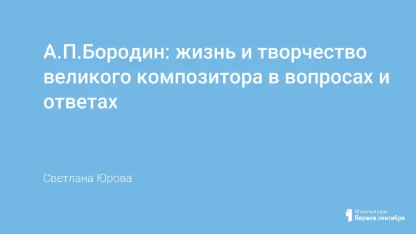 Данная работа представляет собой интеллектуальную викторину, сопровождаемую презентацией. Целью викторины является подведение итогов знакомства с основными жизненными этапами и крупными творческими достижениями великого русского композитора А.П.Бородина.