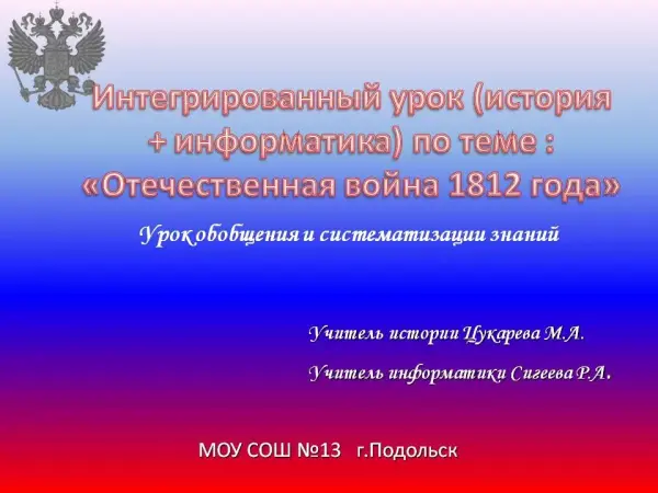 Урок обобщает знания школьников по истории Отечественной войны 1812 года; акцентирует внимание на важнейших событиях, определяет их значение в ходе войны; показывает народно-освободительный характер войны, роль народных масс в победе над врагом, героизм русского солдата и талант русских полководцев; рассматривает итоги и значение победы русского народа, как для России, так и для народов Европы.