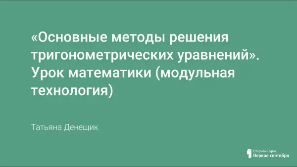 Урок с использованием технологии блочно-модульного обучения в 10-м классе посвящен основным методам решения тригонометрических уравнений. На уроке рассматриваются однородные тригонометрические уравнения, тригонометрические уравнения, которые можно решить разложением на множители, методом замены. В течение урока оценивается выполнение каждого учебного элемента. Оценки накапливаются в ведомости, на основании которой выставляется итоговая оценка за работу над модулем.