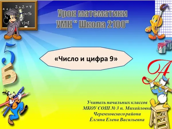 Цель урока: в ходе практической деятельности и наблюдений сформировать представление о числе 9, его составе; научить писать цифру 9, выполнять действия сложения и вычитания в пределах 9; тренировать умение составлять выражения показывающие связь сложения с вычитанием
