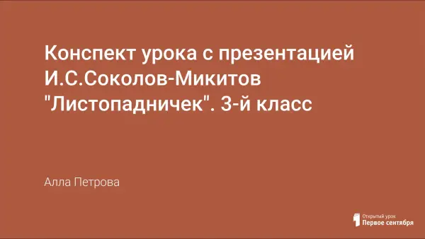 Цели урока: познакомить с творчеством И.С.Соколова-Микитова и его произведением «Листопадничек»; развивать навыки выразительного чтения, учить озаглавливать смысловые части, давать характеристику главным героям, определять тему и главную мысль рассказа.