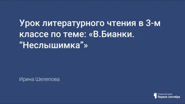 На уроке идёт закрепление знаний по прочитанному тексту В.Бианки "Неслышимка". Дети совершенствуют свои навыки составления плана и умения работать с иллюстрацией и текстом. Также закрепляются знания произведений В.Бианки при помощи вопросов викторины. Главной воспитательной целью является привитие детям любви к животным и природе.