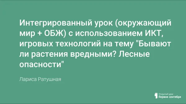 Данный урок проводится в форме путешествия – дети отправляются на прогулку в лес. Урок позволяет с помощью ИКТ, игровых технологий выяснить, какие опасности подстерегают нас в лесу; закрепить понятия «съедобные», «несъедобные» грибы, ягоды; научить детей правилам поведения в лесу и оказанию первой медицинской помощи при отравлениях ядовитыми растениями, ушибах, ссадинах, переломах.