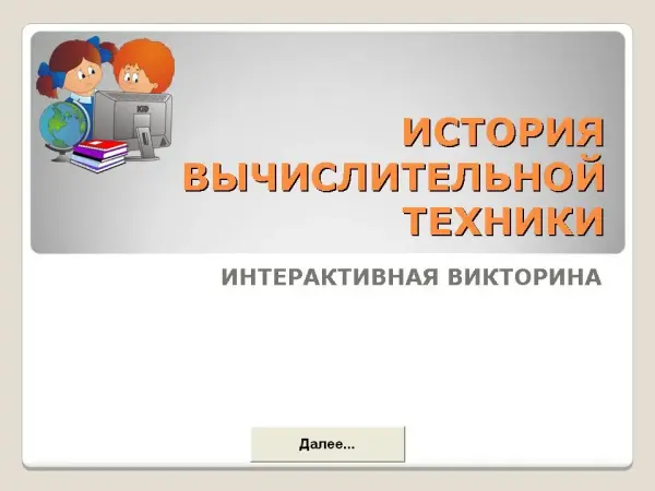 В работе представлена викторина по информатике, которая не только поможет учащимся обобщить изученный материал, но и познакомит их с некоторыми интересными фактами, связанными с вычислительной техникой и информационными технологиями. Для проведения викторины используется "умная" презентация, которая "знает" названия команд, чей сейчас ход, какой вопрос уже был задан, а какой еще нет. Может определить правильность ответа, а также текущий счет и кто победил.