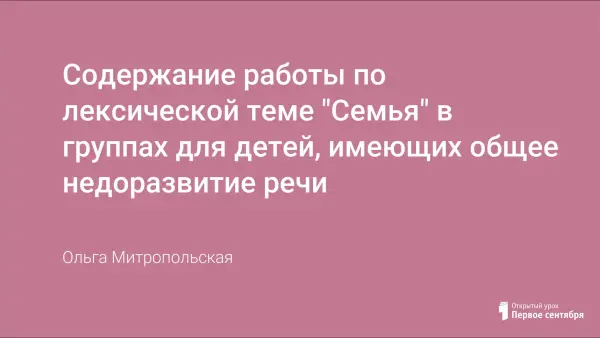 Тема «Семья» – одна из самых близких ребёнку и, в тоже время, наиболее сложных тем для усвоения, особенно для детей с диагнозом общее недоразвитие речи. В статье предлагается лексико-грамматический материал по этой теме, который могут использовать специалисты (учителя-логопеды, учителя-дефектологи, педагоги-психологи) и воспитатели в работе с детьми дошкольного и младшего школьного возраста.