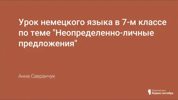 Цель урока: формирование знаний о неопределенно-личных предложениях, об образовании употреблении данных предложений. При изучении и закреплении нового материала используются игры и задания разного типа: поставить глагол в нужной форме; составить предложения, соблюдая порядок слов; перевести на русский язык; найти немецкий эквивалент к русскому предложению; сравнить русские и немецкие предложения. Урок дополнен презентацией, которая раскрывает грамматический материал употребления неопределенно-личного местоимения «man» в неопределенно-личных предложениях. Презентация содержит схемы, правило, примеры употребления неопределенно-личных предложений и правило перевода данных предложений с немецкого на русский и с русского на немецкий язык. Презентация позволяет сделать материал урока доступным и понятным.