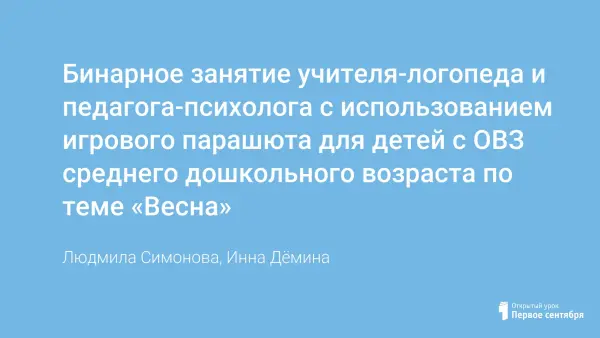 Цель занятия: закрепление знаний детей по лексической теме «Весна» с помощью игрового парашюта, активизация словаря. В ходе занятия развивается познавательная активность в двигательно-игровых действиях, артикуляционная, мелкая и общая моторика, речевое дыхание, логическое мышление. Также формируются грамматические компетенции, пространственные представления, произвольное поведение, целенаправленное внимание, обогащается эмоциональный опыт ребенка.