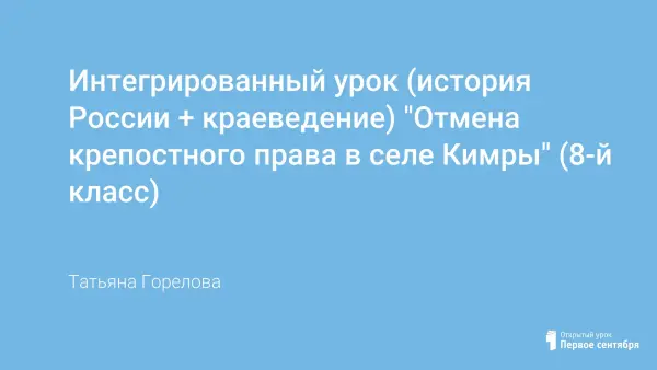 Особенностью урока является изучение темы отмены крепостного права в контексте истории Тверского края, а также в контексте малой Родины – села Кимры. На каждом этапе урока применяются различные формы и методы: тестирование, фронтальный опрос, обобщающая беседа, доклады учеников, использование презентаций учителя и учеников, заочная и очная экскурсии по экспозициям музеев страны и города Кимры.