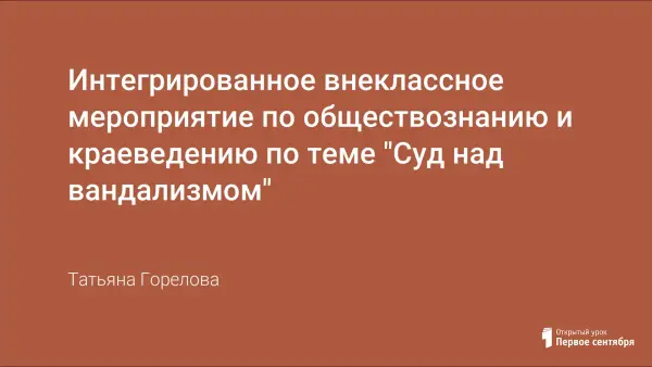 На основе краеведческих и исторических материалов раскрывается смысл обязанности граждан РФ «Охрана памятников истории и культуры». Занятие проходит в форме судебного заседания, где ученики – основные действующие лица. Огромное значение имеет подготовительный этап: доклады, социологический опрос, использование статей из периодической печати.