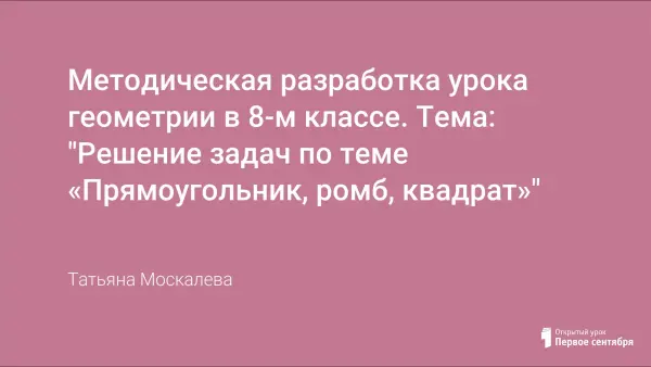 Задачи урока: научиться распознавать прямоугольник на чертежах, находить стороны, используя свойства углов и диагоналей; научиться распознавать и изображать ромб, квадрат, находить стороны и углы, используя свойства, решать задачи по теме. Формирование умения работать с геометрическим текстом, точно и грамотно выражать свои мысли в устной и письменной речи с применением математической терминологии и символики.