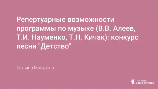 Сценарий конкурса песни «Детство» построен на песнях на музыку В.В. Алеева, Т.И. Науменко, Т.Н. Кичак, с обозначением этапов подготовки к конкурсу и песенным репертуаром.
