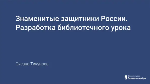 Статья содержит описание библиотечного урока в начальных и средних классах, который можно провести к 23 Февраля, 9 Мая. Также это урок формирования основ информационной грамотности. Раскрывается справочный аппарат книги, отрабатывается самостоятельный поиск информации по заданиям. Особенностью урока является использование презентации «Знаменитые защитники России», книжной выставки-викторины, энциклопедий.