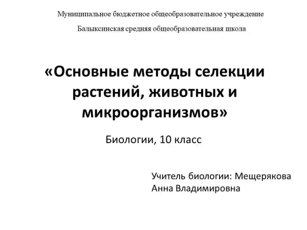 К уроку биологии подготовлена презентация по теме "Основные методы селекции растений, животных и микроорганизмов".