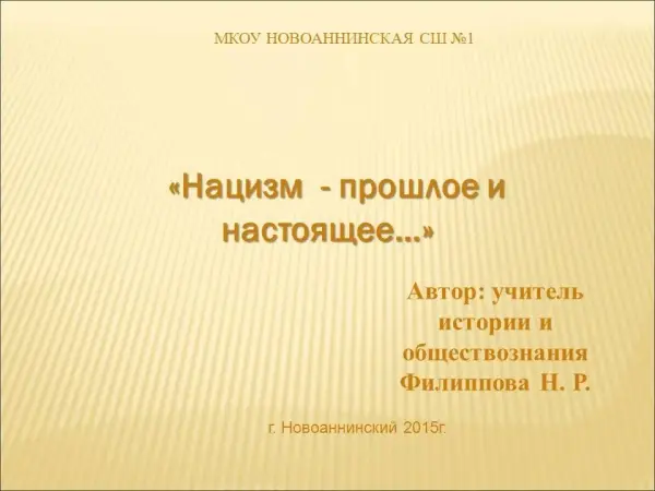 Тема актуальна в связи с активизацией неонацизма в мире. Рассматриваются вопросы о зарождении идеологии нацизма, практическом проявлении в годы войны. Подобрана информация о неонацизме в XXI веке, демонстрирующая опасность и губительность этой идеологии для общества в целом.