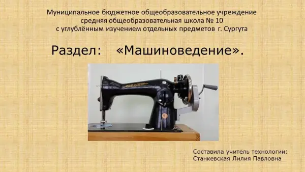 Методическая разработка урока в рамках системно-деятельностного подхода знакомит учащихся с устройством и принципом работы швейной машины класса 2М ПМЗ. Демонстрация обучающего материала в виде слайд-урока по сравнению с традиционным объяснением учителя отличается строгостью, научностью изложения, наглядностью и носит диалоговый характер. Слайд-урок дает возможность увидеть целостность обучающего материала (раздела, темы) и взаимосвязь изучаемых понятий.
