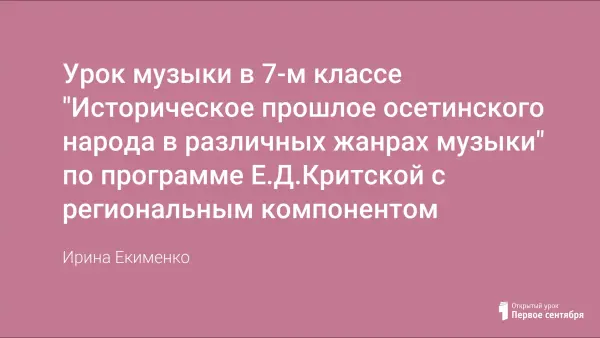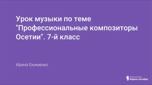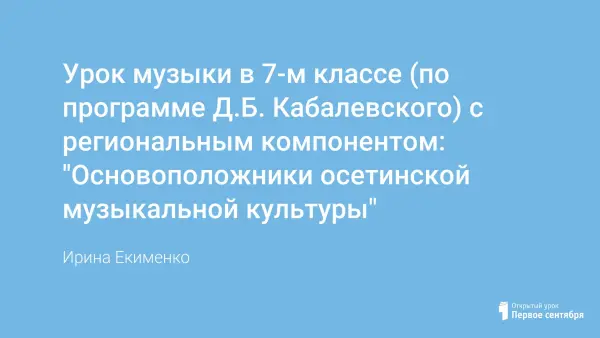 Урок музыки в 7-м классе по программе Д.Б. Кабалевского с региональным компонентом. Учащиеся знакомятся с жизнью и творчеством выдающихся осетинских композиторов современности. Урок воспитывает у детей гордость за свою малую родину, любовь к родному краю, знакомит не только с прекрасными творениями авторов, но и с классикой осетинского кинематографа.