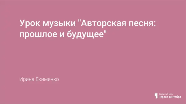 Расширение представлений учащихся об авторской песне как музыкальном жанре и общественном движении, на примерах известных авторских песен Б.Окуджавы, С.Никитина, В.Высотского, О.Митяева и др. Показать учащимся, что творчество многих авторов-исполнителей выходит за круг чистой развлекательности, затрагивая серьезные проблемы нашей жизни и общества, умение выражать ценностные суждения или свою позицию по обсуждаемой проблеме.