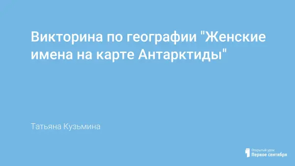 Викторина по географии «Женские имена на карте Антарктиды» - это внеклассное мероприятие, призванное расширить круг географических знаний школьников. Мероприятие создано для поддержания интереса к предмету, развития стремления к получению новых знаний, воспитанию патриотов своей Родины. Цель мероприятия: познакомить учащихся с картой Антарктиды и происхождением некоторых названий на ней.
