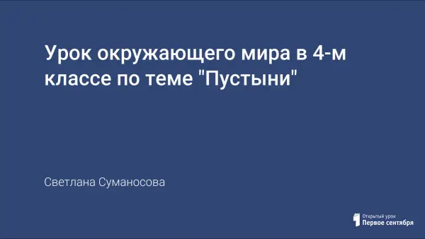 Предлагается урок по окружающему миру в 4-м классе по учебнику А.А. Плешакова. Урок проводится с использованием интерактивной доски в виде презентации. На уроке дети виртуально попадают в пустыню, знакомятся с ее особенностями, с животным и растительным миром, разгадывают ребусы и проводят исследовательскую работу.