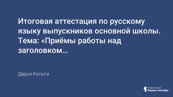 В данном исследовании рассматривается вопрос о приёмах работы над заголовком текста при подготовке девятиклассников к написанию экзаменационного сочинения. Первейшее условие верного восприятия текста – понимание каждого его слова. Одним из важнейших приёмов в понимании текста является осмысление его заголовка.