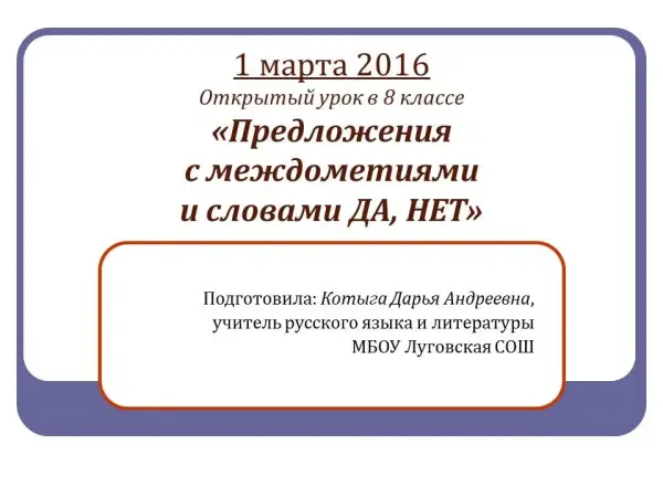 Презентация знакомит учащихся с междометиями и знаками препинания при них, а также с особенностями пунктуации слов-предложений "да" и "нет".