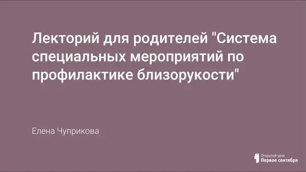В последнее десятилетие детская близорукость значительно "помолодела". Для родительской общественности города было проведено мероприятие по ознакомлению с системой мероприятий по профилактике близорукости. Лекторий сопровождается слайдовой презентацией. Для практической помощи родителям подготовлены буклеты "Играя, лечимся".