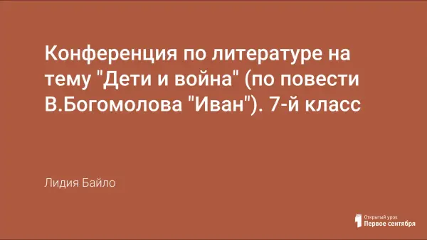 Цель конференции: на примере литературных произведений показать учащимся, что дети и война несовместимы. Автор знакомит учеников с именами детей – Героев Советского Союза, анализирует художественные произведения, главное из которых – "Иван" В.Богомолова.