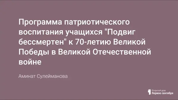 Программа представляет собой объединённый замыслом и целью комплекс досуговых, социально-воспитательных, физкультурно-оздоровительных и спортивных мероприятий с учащимися, призванных обеспечить решение основных задач в области патриотического воспитания учащихся образовательного учреждения.