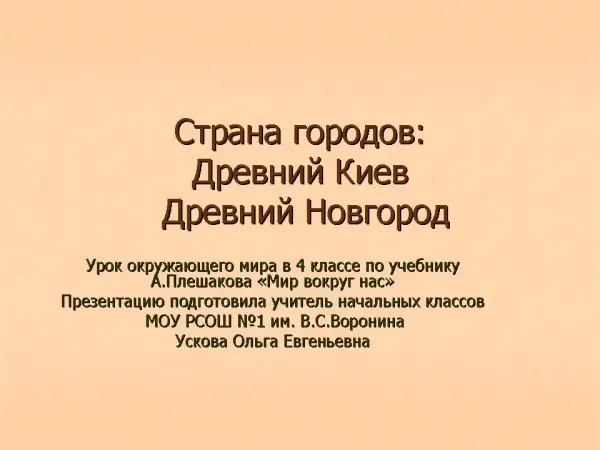 Урок окружающего мира по учебнику А.А. Плешакова «Зелёный дом» знакомит учащихся с древними городами Руси X-ХI вв. Киевом и Новгородом, их становлением, главными достопримечательностями. В ходе урока используется презентация по соответствующей теме, текст учебника.