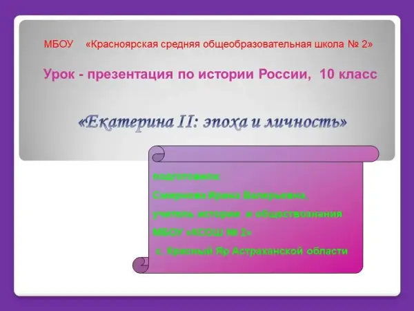 В основе урока - исторический портрет Екатерины II. Составление исторической характеристики является важной работой, так как при сдаче ЕГЭ по истории есть задание № 25 (бывшее С6), историческое сочинение. Это урок-практикум, где учитель продолжает отработку практических навыков учащихся при подготовке к экзамену. Учащиеся извлекают информацию из разных источников, используют содержащуюся в них информацию для аргументации своей точки зрения, делают собственные выводы.