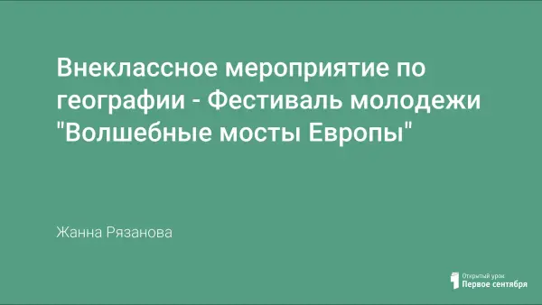 Внеклассное мероприятие по географии «Волшебные мосты Европы» проводится в игровой форме – «Фестиваля молодежи». Участниками фестиваля являются учащиеся 10-х классов, которые представляют делегации из европейских стран (страны могут быть любые, желательно из разных субрегионов Европы) и в красочной форме рассказывают о достопримечательностях, культуре, быте, национальных особенностях своей страны. Гостями фестиваля являются учащиеся 7-х классов.