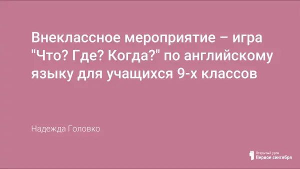 Внеклассное мероприятие по английскому языку для учащихся 9-х классов проводится в форме игры «Что? Где? Когда?» по теме “Countries and People”. Участие в таких мероприятиях способствует развитию памяти, языковой догадки, коммуникативно-игровых способностей, расширяет кругозор и повышает мотивацию к изучению иностранного языка.