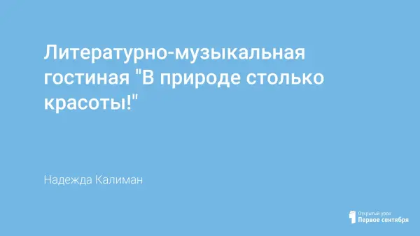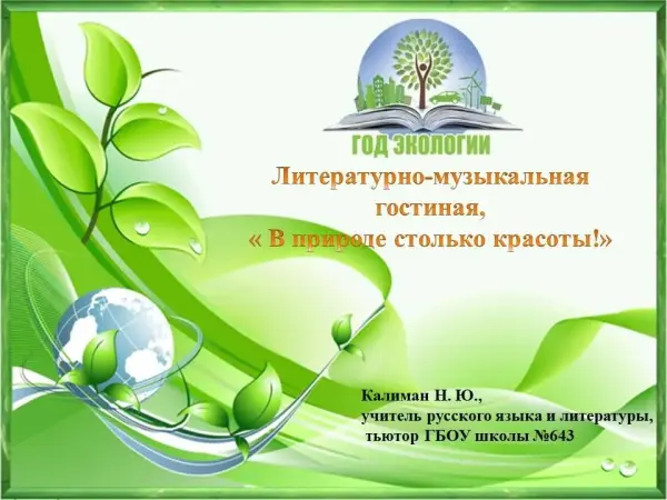 Представлен сценарий литературно-музыкальной гостиной «В природе столько красоты!», посвященной Году экологии в России. Цель внеклассного мероприятия: создание оптимальных условий для формирования гражданина России, любящего свою Родину, способного осознать последствия своих действий по отношению к окружающей среде, умеющего жить в гармонии с природой, чувствовать её красоту.