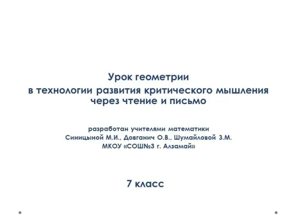 Урок геометрии разработан в технологии развития критического мышления через чтение и письмо ребус. Использованы приемы: корзина идей; верные, неверные утверждения; инсерт; кластер.