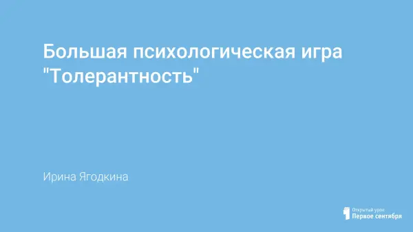 Игра «Толерантность» посвящена актуальной проблеме – воспитанию у подростков терпимого отношения к себе и к окружающим, независимо от личностных особенностей, убеждений, этнической принадлежности. Цели игры: сделать понятие «толерантность» близким и ясным для каждого участника игры: стимулировать воображение участников в поисках собственного понимания толерантности.