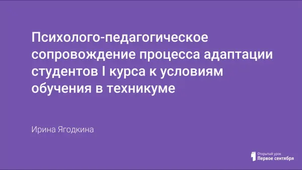 Статья посвящена проблеме адаптации студентов I курса к условиям обучения в техникуме. Предложена примерная программа психолого-педагогического сопровождения адаптации студентов, определены основные направления работы и ожидаемые результаты. Предложенная программа рассчитана на первый год обучения студентов в техникуме и осуществляется как в процессе преподавания учебных дисциплин, так и в процессах учебного и внеучебного взаимодействия со студентами.