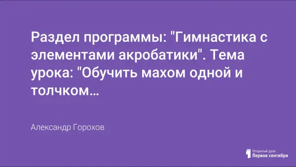 Задачи урока: совершенствовать технику акробатических упражнений; обучить махом одной и толчком другой стойку на руках с помощью; совершенствовать умения выполнять комплекс общеразвивающих упражнений на гимнастической скамейке; развивать физические качества с помощью гимнастической полосы препятствий: быстроту, ловкость и координационные способности.